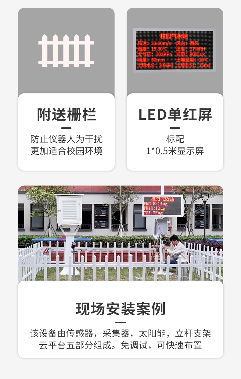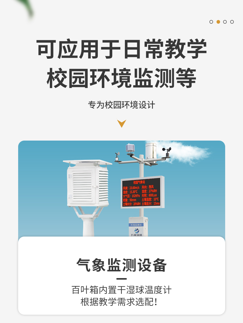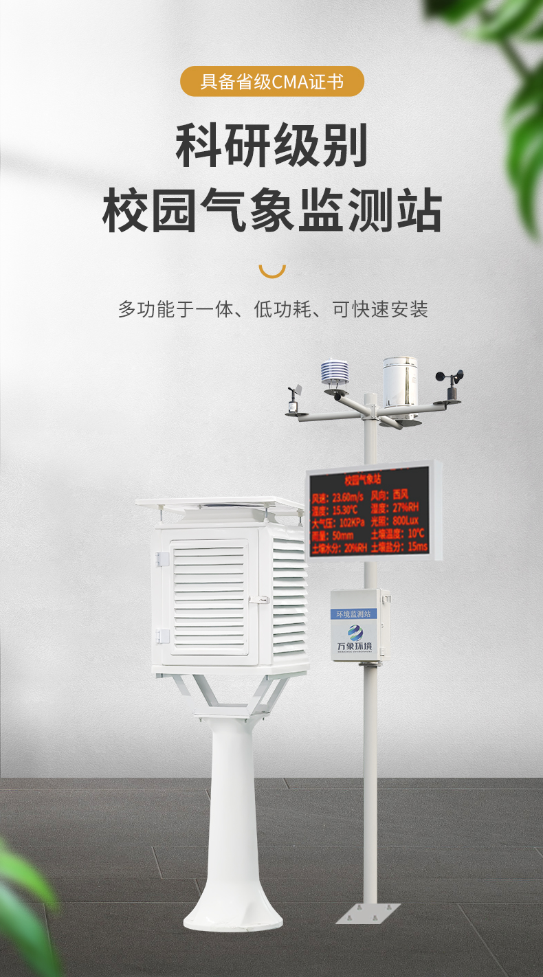 中小學(xué)校園氣象站解決方案WX-XQ4校園氣象站是一款高度集成、低功耗、可快速安裝、便于教學(xué)使用的科研級氣象站。