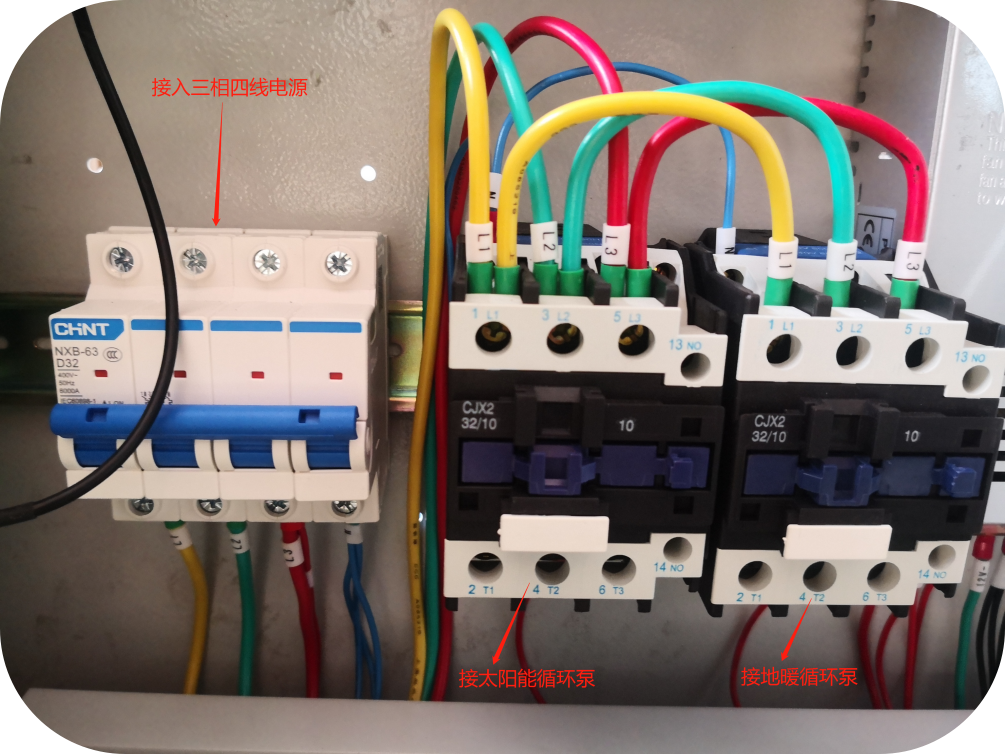 如下圖所示,安裝指示標(biāo)識(shí)正確接入線路,空氣開(kāi)關(guān)依線號(hào)接入三相四線電源,交流接觸器輸出端分別接太陽(yáng)能循環(huán)泵和地暖循環(huán)泵。